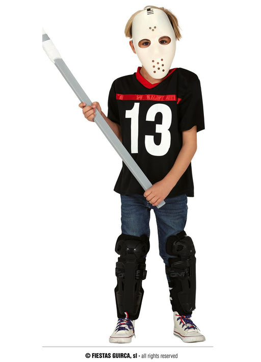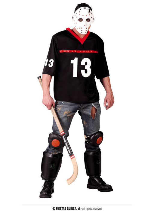Become a murderous hockey player this Halloween with this 3 piece costume consisting of black "number 13" top, shoulder pads and white mask. Hockey...