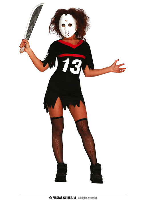 Halloween horror costume with white hockey face mask, black dress with red trim and printed number 13 along with pair of black stockings.