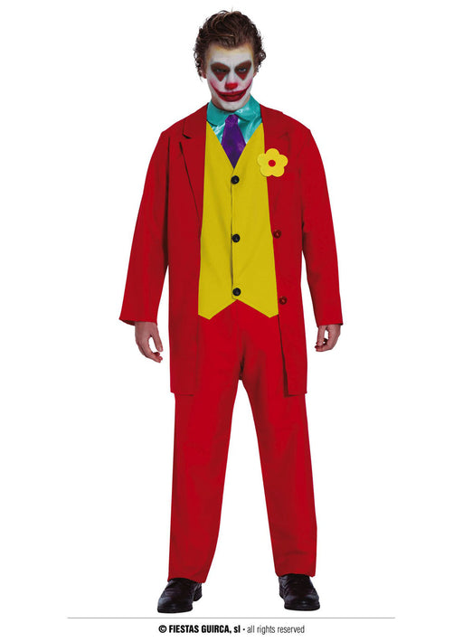 Halloween clown joker costume consisting of red jacket with flower and attached yellow waistcoat, mock shirt with tie and elasticated trousers.