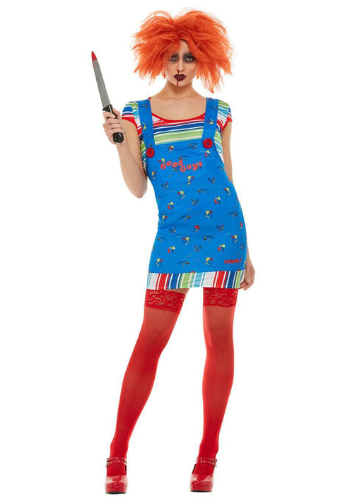 Licensed Chucky ladies Halloween costume with striped top and short dungaree dress. Wig, stockings and knife available separately. Size Dress B...