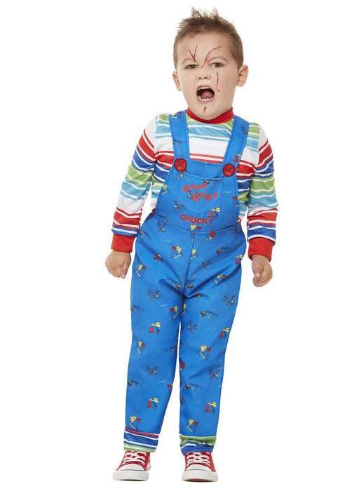Child's officially licensed Halloween Chucky costume with striped top and printed blue dungarees. Size Age Chest Waist Height Small 1-2 19 ½''...