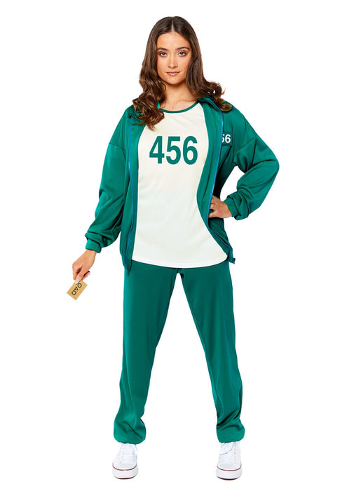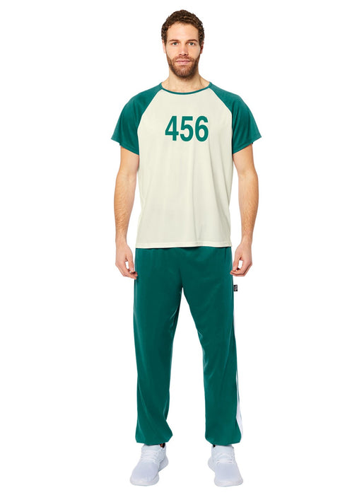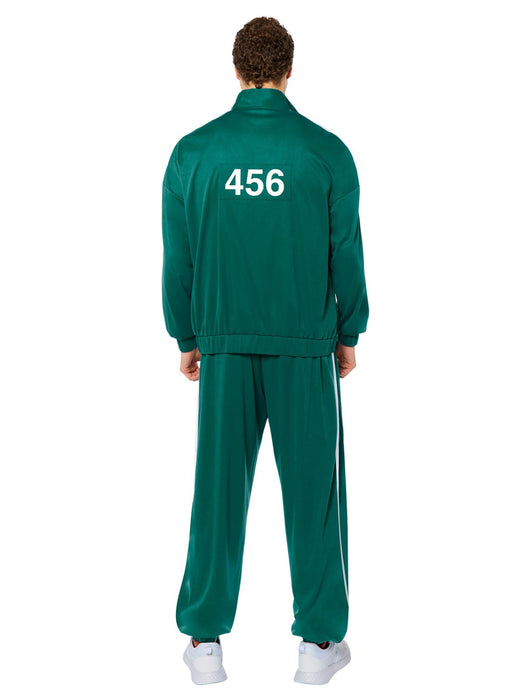 Player 456 officially licensed Netflix Squid Game unisex costume from the hit show with green tracksuit top and trousers along with numbered t-shirt. Available in 5 sizes.