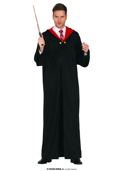 One size unisex Magic Student costume with long black tunic with red lined hood. Add some Harry Potter glasses and wand to get the wizard look!