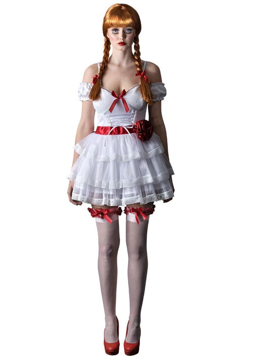 White and red Annabelle officially licensed The Conjuring horror Halloween costume with mini dress, hold ups and hair ribbons. Wig and a character ...