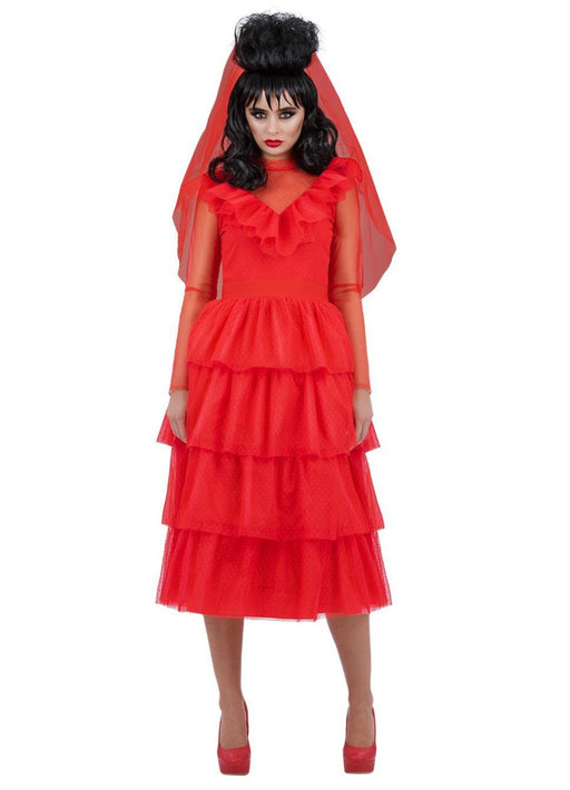Beetlejuice officially licensed Halloween Lydia Bride costume with red layered dress and veil. Size Dress Bust Waist Hip Small 8-10 34 ½''-35...