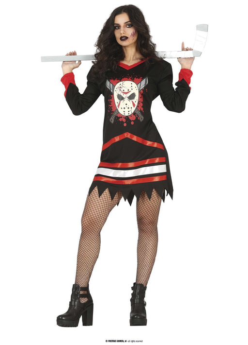 Halloween horror hockey costume with consisting of black, red and white short printed dress.