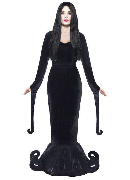 Duchess of the manor costume in the form of Morticia from the Addams family. Costume consists of long black velvet effect dress with draped sleeves...