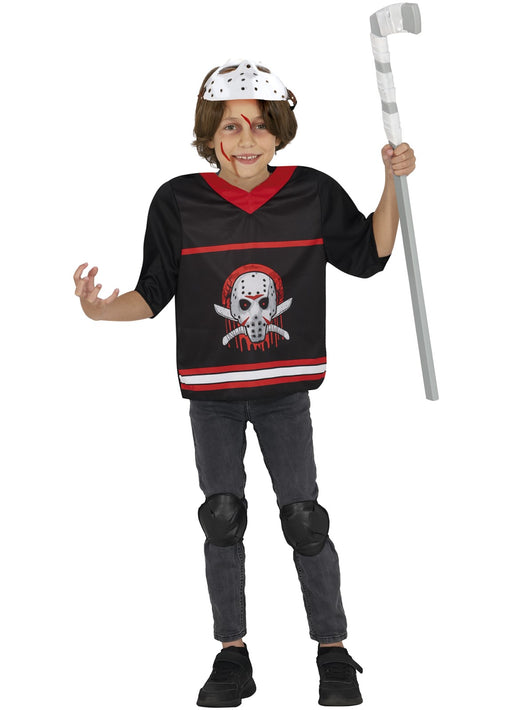 Halloween hockey player horror costume with face mask, black and red printed shirt and shoulder pads. Hockey stick not included.