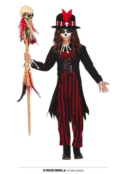 Halloween Voodoo costume with feathered hat, jacket with attached shirt and striped trousers.