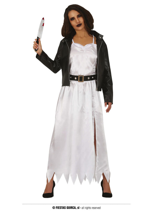 Costume includes black mock leather jacket, long white dress and belt with buckle.