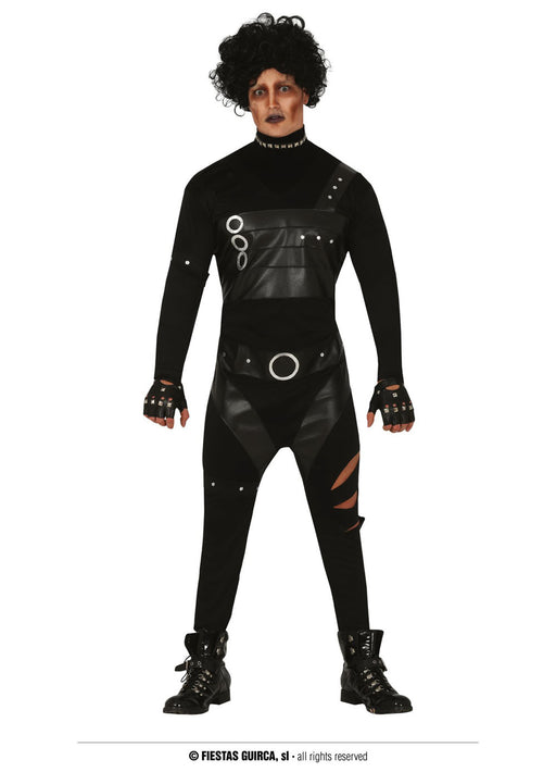 Halloween black scissor man costume with in all one jumpsuit with mock leather belt and chest along with an arm and leg cuff. Add some make-up and ...