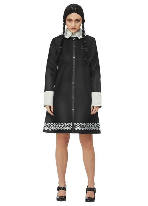 Officially licensed Adams Family Wednesday character costume with dress and black plaited wig.