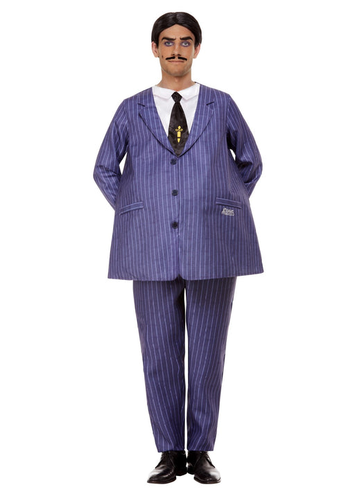Officially licensed The Addams Family Gomez character costume with purple hooped trousers, jacket with attached shirt and tie, wig and moustache. ...