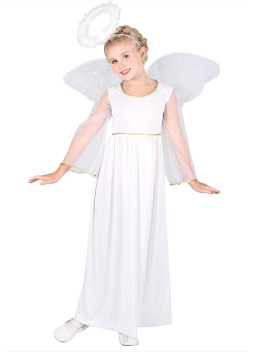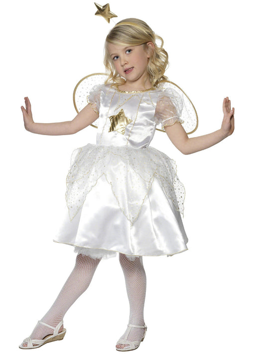 3-piece Nativity Angel Gabriel fancy dress costume consisting of a white and gold dress, detachable wings and gold star design headpiece.