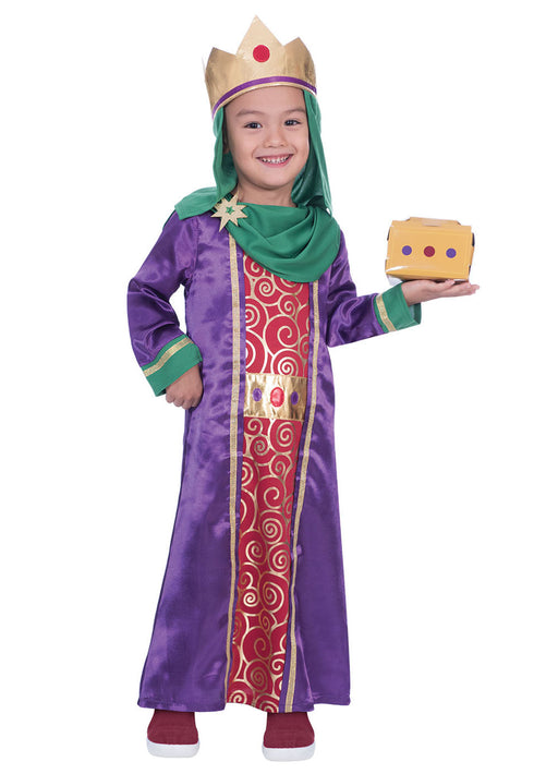 3-piece Nativity King costume consisting of tunic, crown headpiece and gift box.