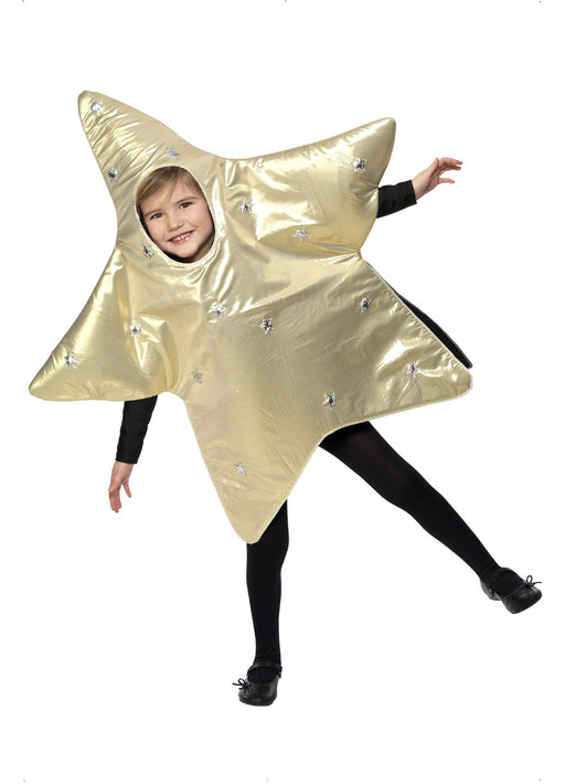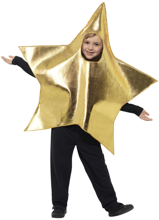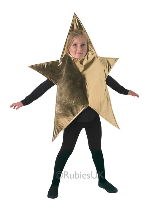 Child's Shining Star fancy dress costume consisting of gold shiny tabard with face slot. Comes in one standard size.