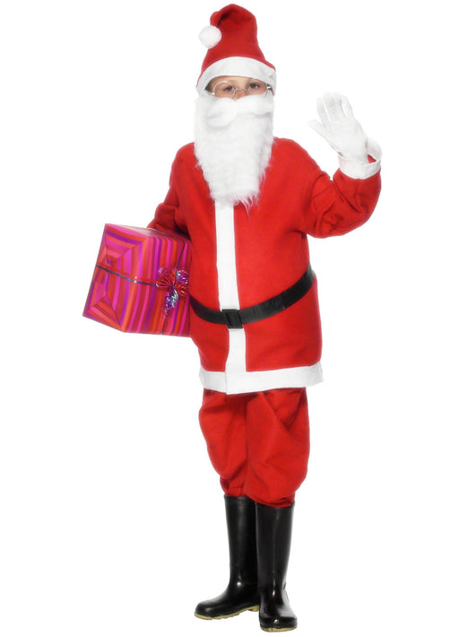 Child's Santa boy costume with jacket, trousers, hat and belt. Size Age Height Small 4-6 years 115-128cm Medium 7-9 years 130-143cm Larg...