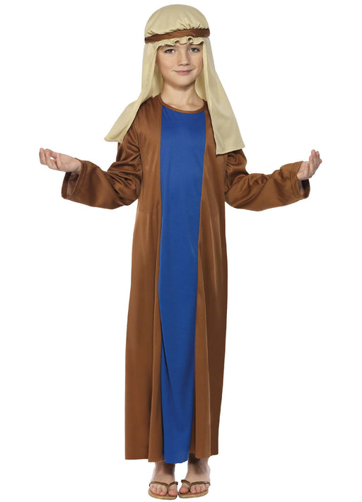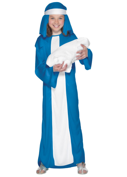 Mary nativity costume includes white and blue long dress and headpiece. Size Age Height Small 4-6 years 115-128cm Medium 7-9 years 130-143...