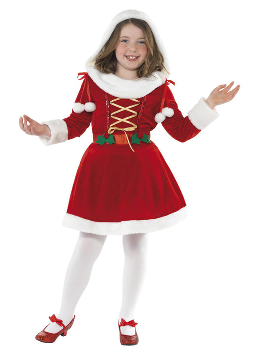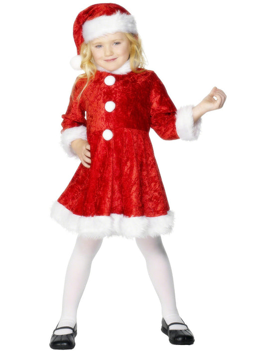 This Mini Miss Santa costume includes a red velour style dress with a white fluffy trim to the collar, sleeves and skirt. Also included is the matc...