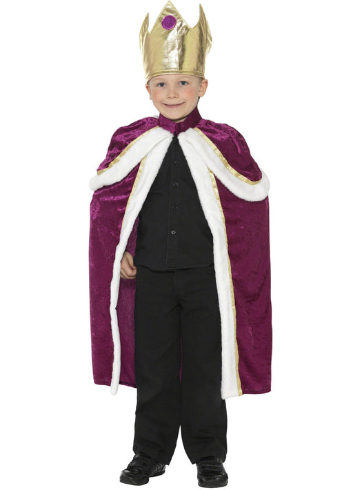 Child's Nativity King fancy dress costume with burgundy coloured robe with puffed shoulders finished with white and gold trim and gold crown headpi...
