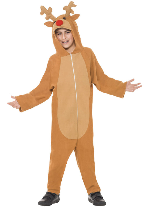 Child's Reindeer all in one costume consisting of brown hooded jumpsuit with attached antlers and red nose & white front zip. Size Age Hei...