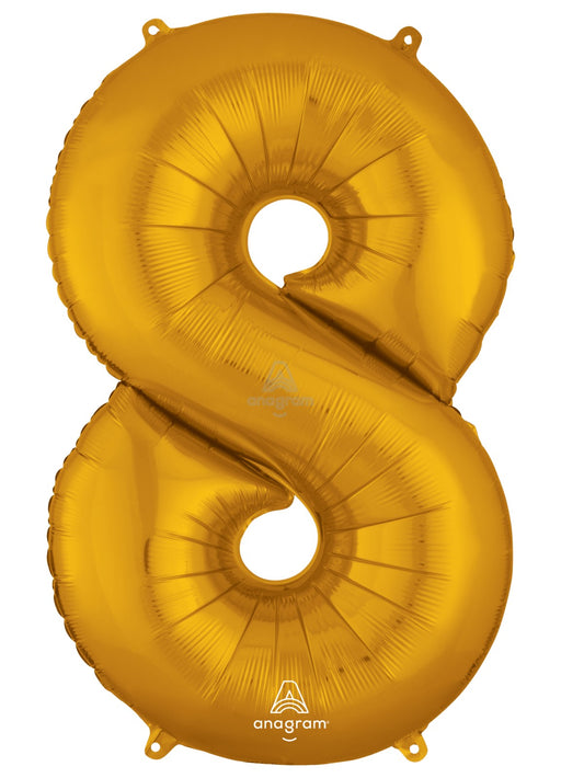 Giant number 8 gold super shape foil balloon measuring approx. 86 cm (34") in height. Click & Collect orders: Balloon supplied inflated with ...