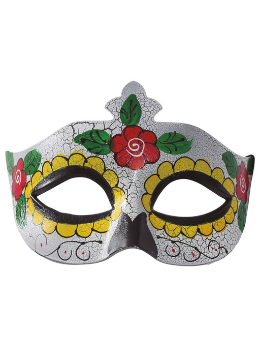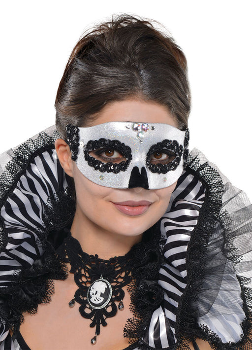 Day of the Dead themed half face eye mask decorated with black & white design and red flower.