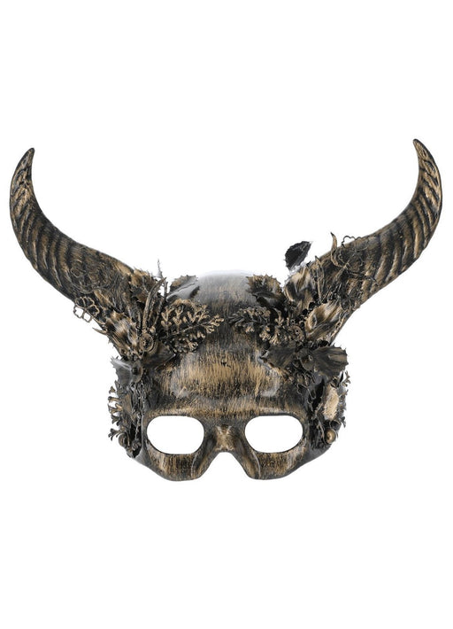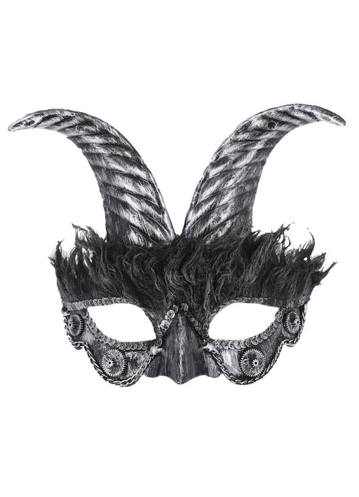 Halloween silver masquerade mask with horns finished with black fur trim.