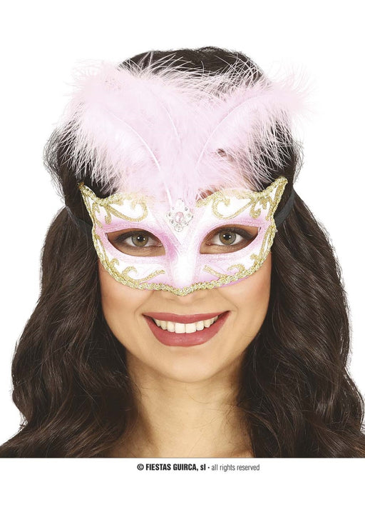 Venetian masquerade eyemask with pink, white and gold design finished with 3 pink feathers.