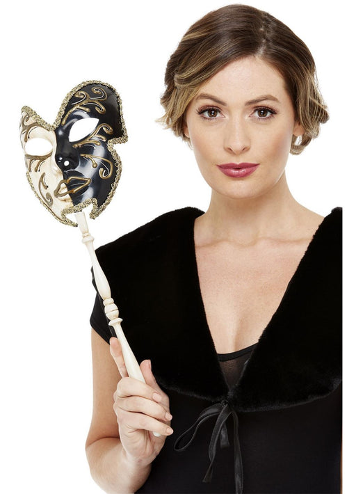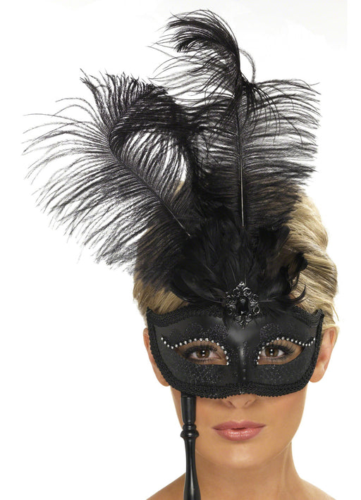 Fever baroque fantasy silver glitter eyemask with attached silver stick for easy use & finished off with white feathers.