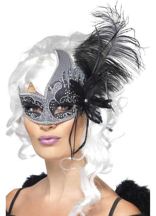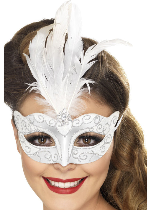 Venetian silver glitter eyemask decorated with central pendant & white feathers.