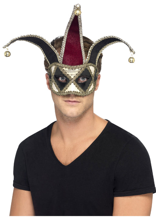 Gothic venetian red & black harlequin eye mask decorated with gold trim and bells.