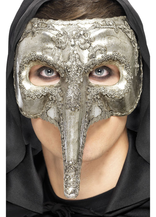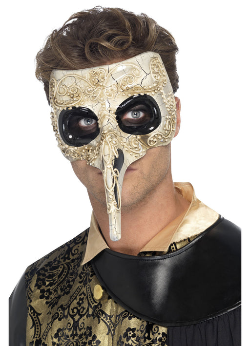 Venetian plague doctor masquerade mask decorated with black eye surrounds, cream swirl decoration & long pointy nose.