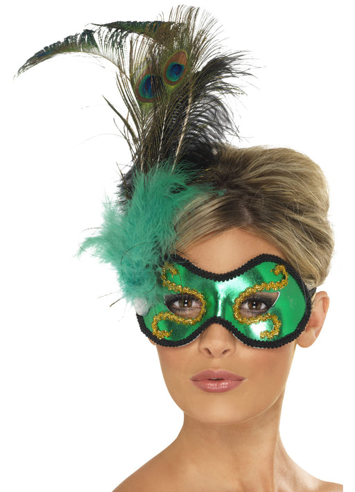 Emerald green peacock design eyemask with attached feathers & finished with gold trim.