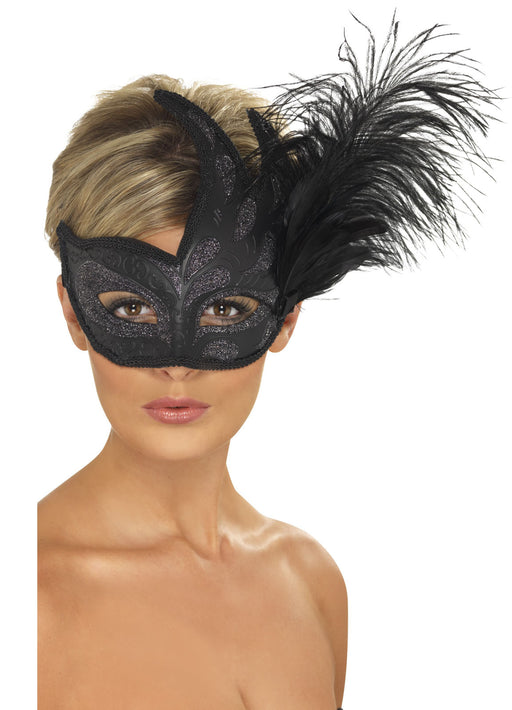 Ornate Colombina black feather eyemask decorated with silver glitter design.
