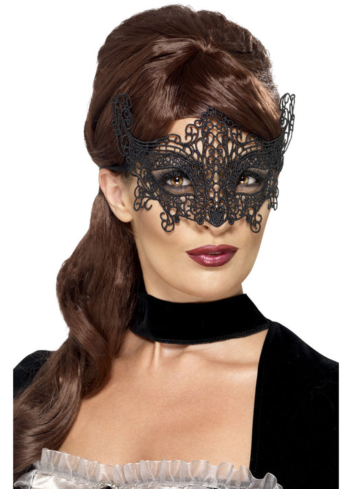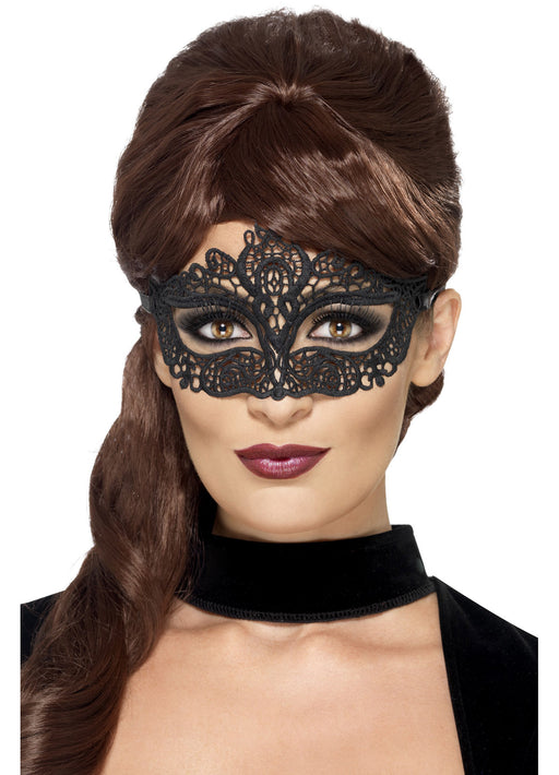 Black lace embroidered masquerade eye mask with black tie up ribbon.