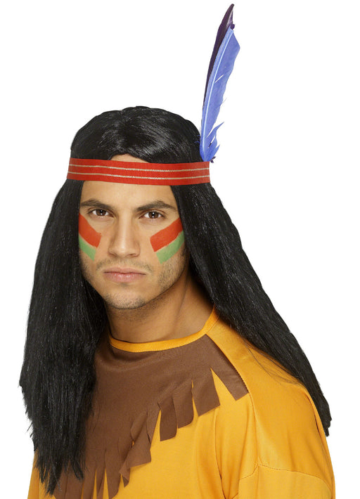 This Indian fancy dress wig is made up of two long black plaits and also includes an embroidered head band with a white feather attached. Please no...