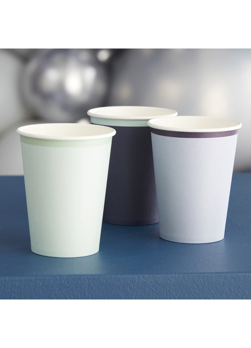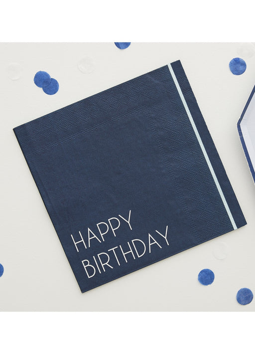 A mixed pack of 8 navy and light blue happy birthday octagon shaped paper plates.