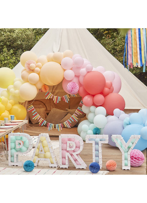 PARTY white balloon mosaic frame with 5 letters measuring between 41cm and 54cm wide by 63cm tall. Comes with easy how to assembly instructions. Yo...