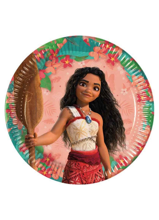 Pack of 8 Moana themed paper party plates decorated with character design.
