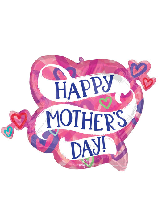 Large jumbo heart satin effect watercolour Happy Mother's Day foil balloon measuring 68 cm x 58 cm (27 in x 23 in) when inflated. Click & Col...