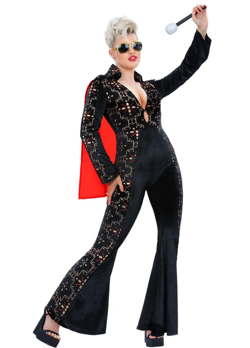 Channel timeless rock‑and‑roll glamour in this eye‑catching Elvis Black Rhinestone Lady Costume featuring a sleek jumpsuit with sparkling rhineston...