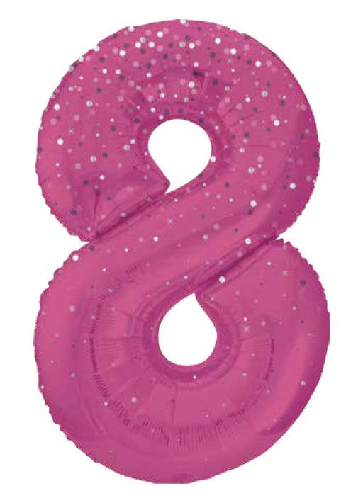 Giant number 8 pink glitz super shape foil balloon measuring 34" in height. Click & Collect orders: Balloon supplied inflated with helium. D...