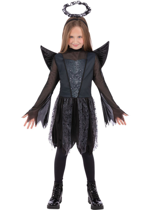 Dark angel Halloween costume featuring a black halo headband, sheer sleeves, and jagged, lace-detailed skirt panels. Complete with bold wings and g...