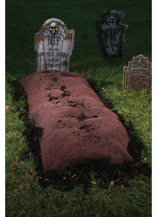 Grave mound Halloween decoration to simulate a freshly dug grave! Measuring 5 ft long just cover a pile of leaves or rags and secure mound with the 6 stakes provided.