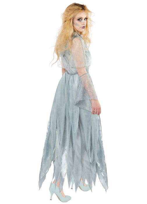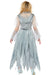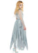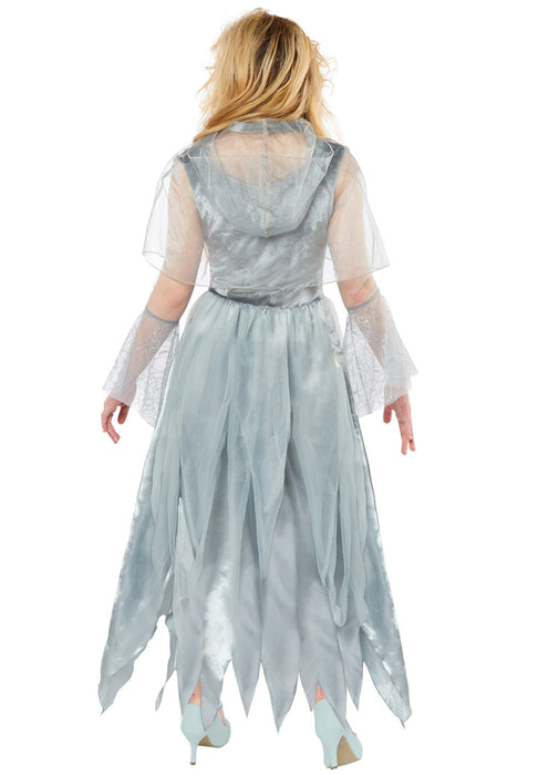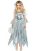 Light grey zombie ghost bride Halloween fancy dress costume with long dress and hooded cape with jewel. Pictured bouquet not included in costume pack.
