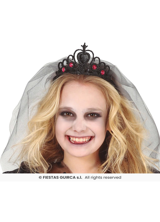 Complete your spooky princess or undead bride look with this eerie black crown headband featuring pink gem accents and a flowing black veil.