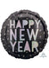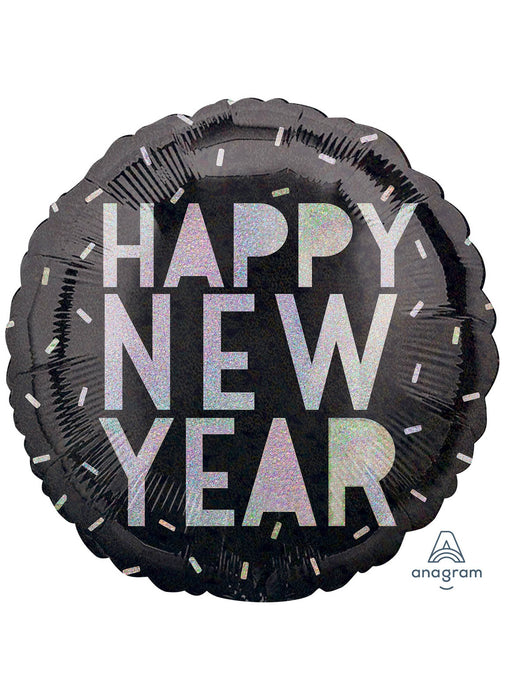Black and silver Happy New Year holographic round standard size foil balloon.