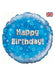 Blue Happy Birthday holographic standard round foil balloon measuring 18" (45.7 cm) when inflated. Made in UK.
