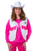 One size fits most cowgirl waistcoat in white with pink tassels and attached sheriff badge.